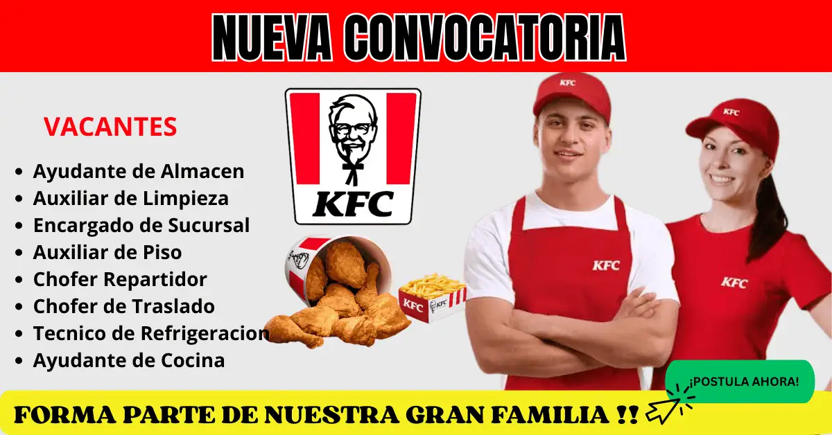 KFC ofrece vacantes con funciones, requisitos y beneficios claros, brindando capacitación, crecimiento profesional y estabilidad laboral en un ambiente dinámico, seguro y lleno de oportunidades.
