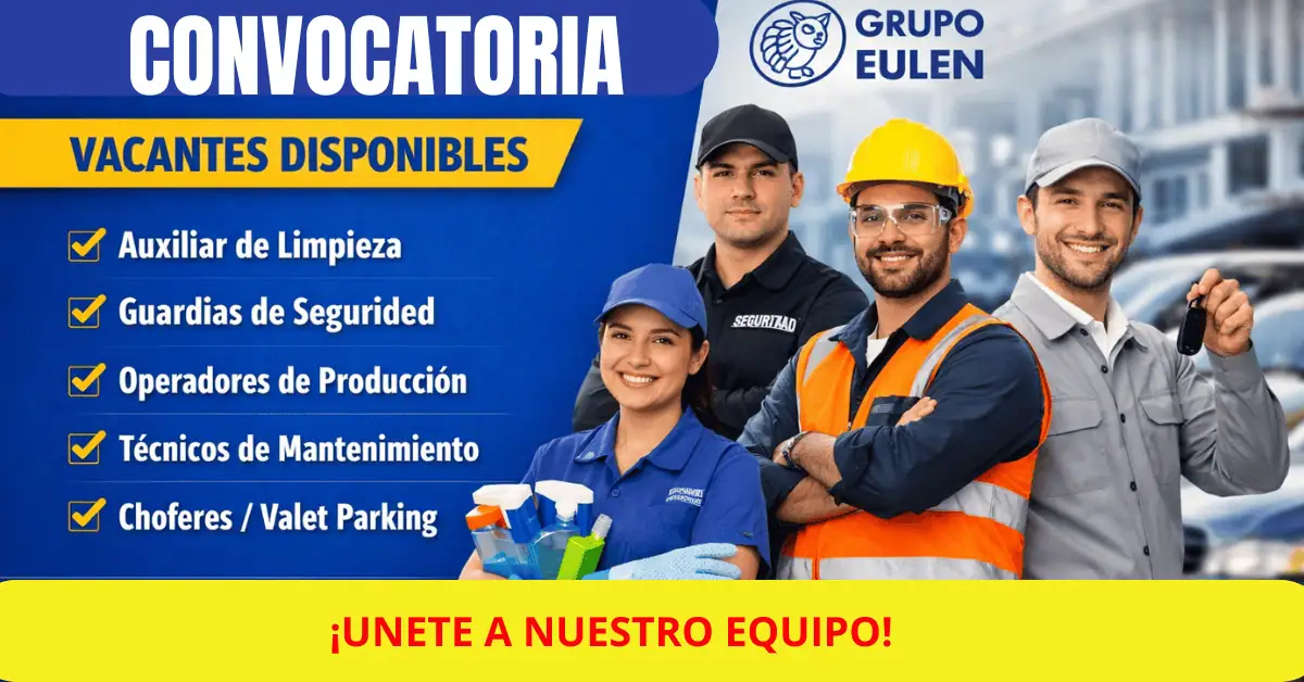 «Grupo EULEN ofrece diversas vacantes con funciones, requisitos y beneficios claros, brindando oportunidades de crecimiento, estabilidad laboral y capacitación constante para profesionales comprometidos.» ✅